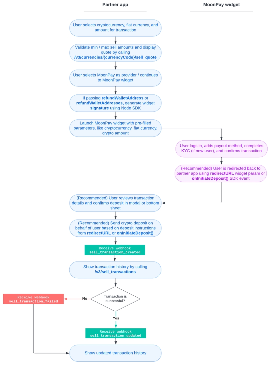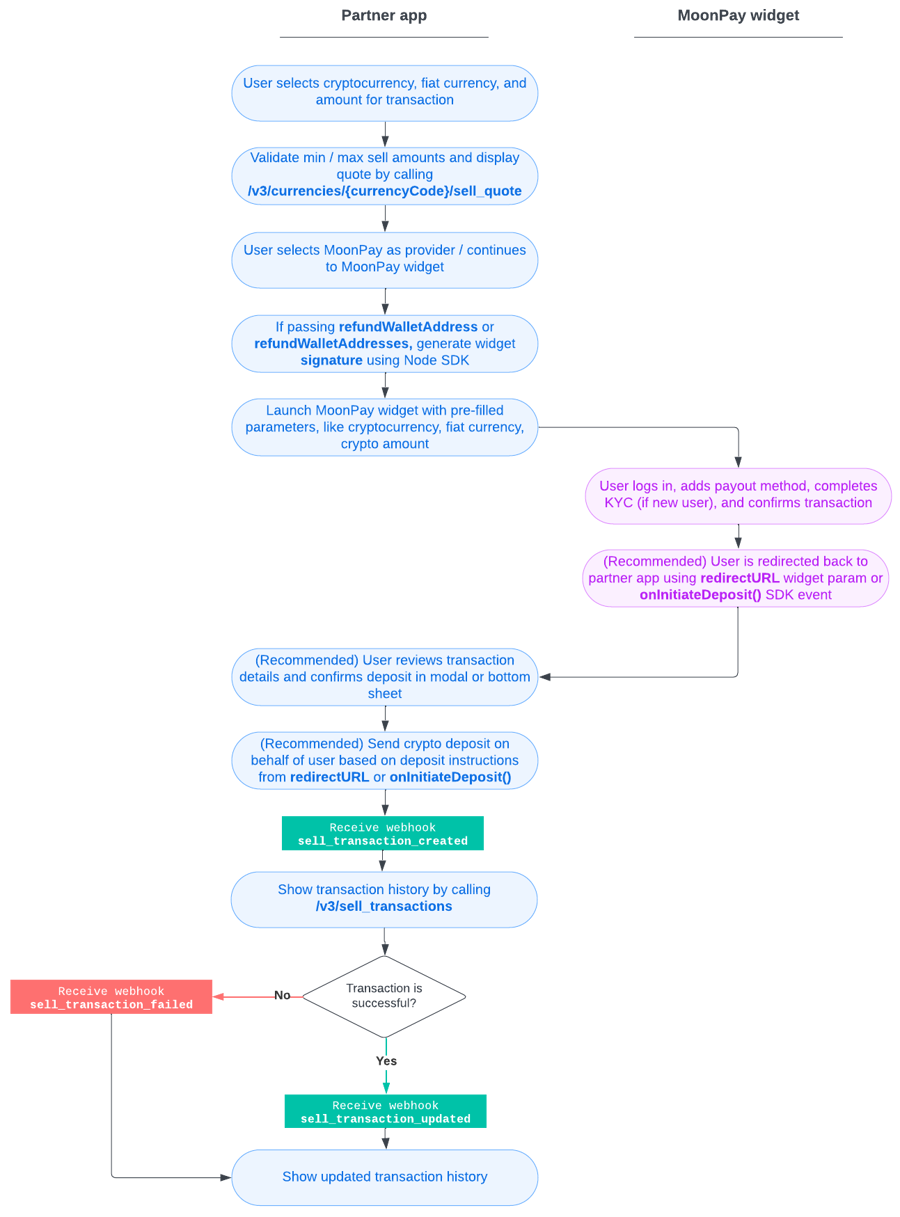 This diagram shows a basic crypto sell flow and the components required for implementation. We recommend using our API and webhooks to provide helpful context in your app, including minimum / maximum sell amounts, quotes, and transaction history.