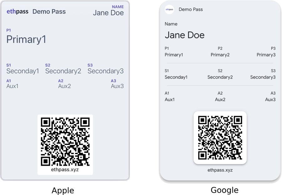 Here is an example of the content that can be rendered on the front of the passes using our universal pass payload.
